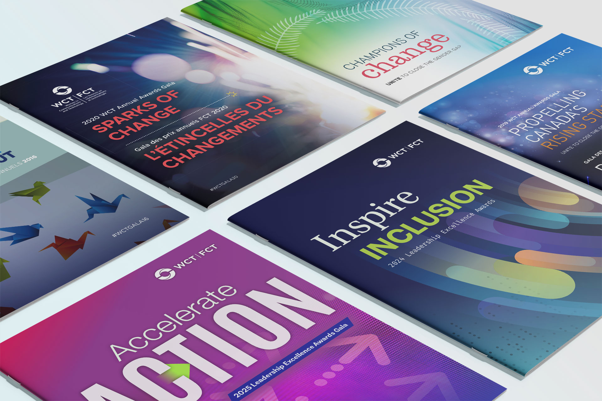 One of Initiate’s earliest projects as a company was WCT’s annual Leadership Awards Gala, and we have developed its look and feel every year since. Based on WCT’s content theme, we provide an appropriate visual theme, including a colour scheme, programmes, menus, PowerPoint templates, and environmental graphics. We have also gone on-site to provide graphics installation support and photography services.